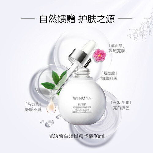 持证安心美白的修护精华,云南山茶精华、VC衍生物及马齿苋精粹等成分相辅相成,实力加速黑色素运转,层层抑黑焕白,敏肌可用!