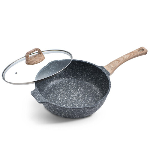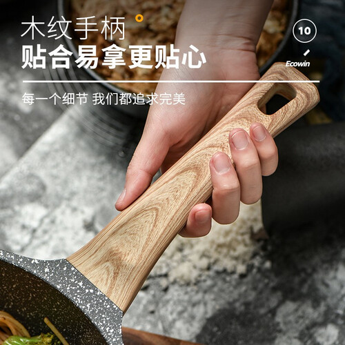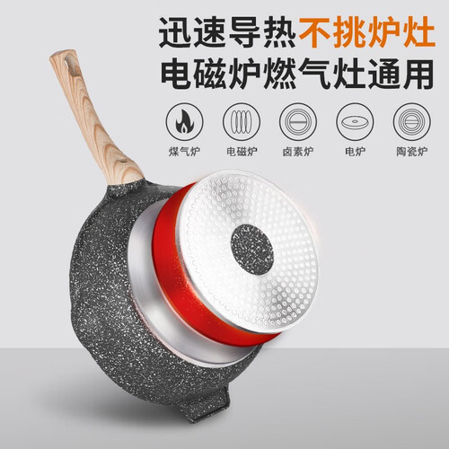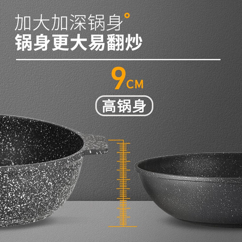 加高锅身任意翻炒,一体压铸成型无铆钉久用不变形;轻巧的锅身女生轻松颠锅,厚而不重,麦饭石涂层耐磨防刮不粘好洗。