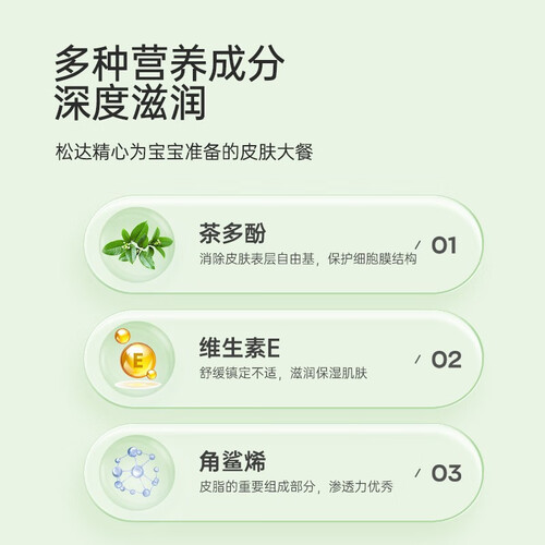 含有茶多酚等多种天然活性成分,滋养宝宝肌肤,有效缓解皮肤泛红。多种补水成分,预防干燥和起皮等肌肤问题。