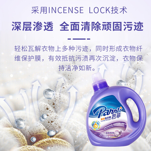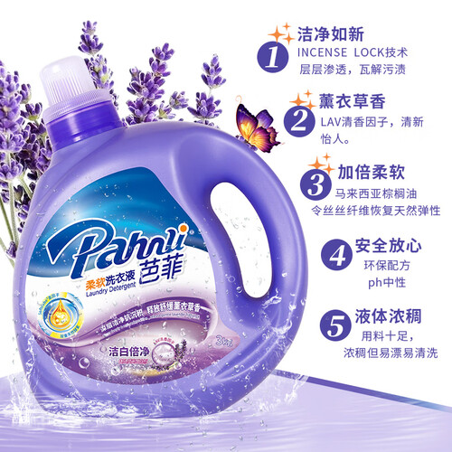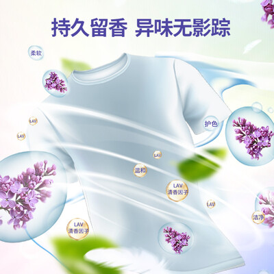 添加LAV清香因子,散发薰衣草味道,长时留香且不易消散。含有马来西亚棕榈油,能够柔滑衣物,穿着更蓬松。