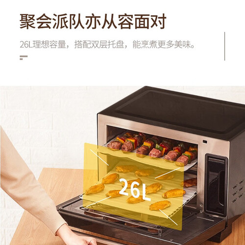 在烤制过程中,不断为食物补充水分,避免口感干柴,让美食香酥可口鲜嫩多汁。26升大容量,搭配双层托盘,一次烹饪多种美味。