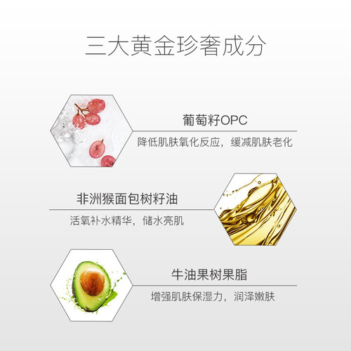 牛油果树果脂油,成分源自天然,赋予肌肤更好的补水滋养效果。含有葡萄籽油,有效对抗肌肤氧化情况,肌肤更加莹弹。