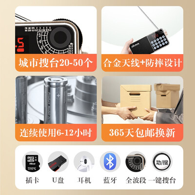 35cm超长天线,信号强,可接收大范围电波,喜欢听的台都有。A级锂电池,续航时间长达12小时,不怕出门没电。