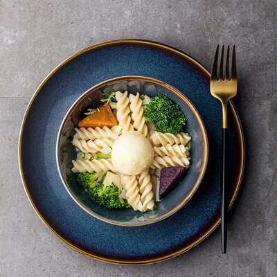 冰蓝系列样式设计,窑变釉的工艺使内部自然形成细密的纹理,如繁星梦幻般。并且配合手绘描边工艺,告别繁琐复杂,装饰简约时尚。