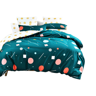 活力多彩的几何图案装饰墨绿色被面,明艳活泼,雅致大方,简约耐看。精选优质棉花制作,触感平滑,细腻亲肤,舒适透气。
