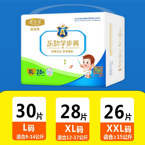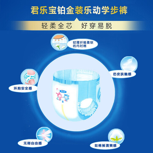 君乐宝拉拉裤采用透气蓬松的打孔面层及特柔亲肤无纺布底层,内置热风吸水层芯体,从内到外实现三重柔软,轻柔呵护萌宝屁屁。