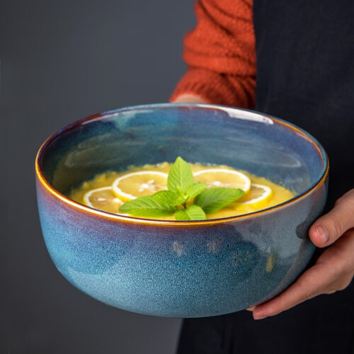 采用窑变釉工艺,着染清新的冰蓝釉色,并具有繁密的纹理,加以手工描绘,如北欧夜空一般唯美,让餐食氛围变得更具美学。