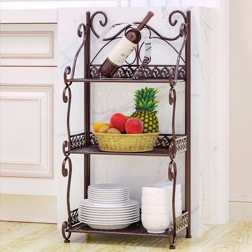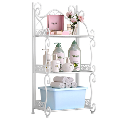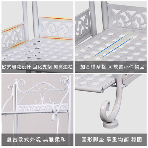 铁管架体经加厚加固处理,承重力强,可以强力承托家居物品。欧式雕花的置物架造型精致美观,为家居环境更添一抹亮色。