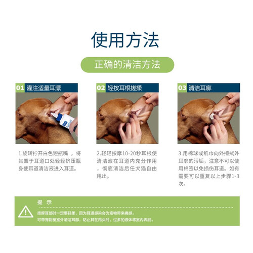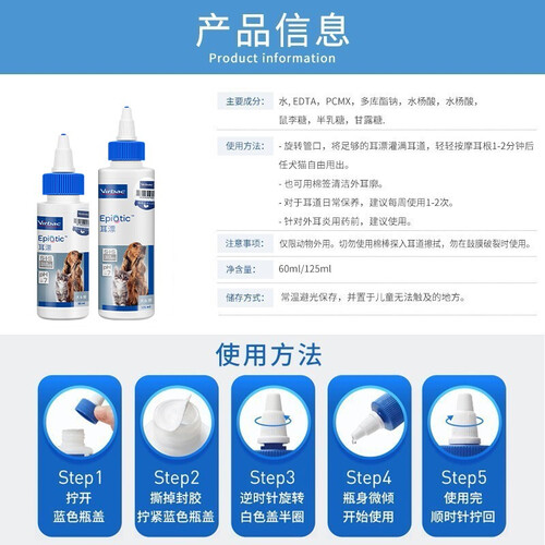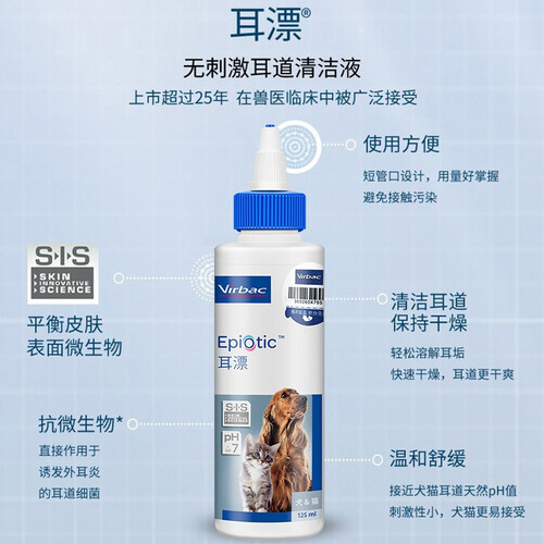 针对外耳炎的常见症状,有效清洁掉耳道病的原菌,缓解耳部问题。液体的PH值接近耳道的值数,刺激性更小。