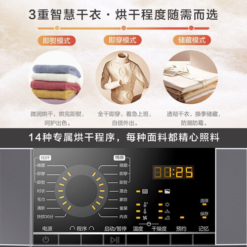 内筒正反转设计,可将衣物抖散,避免缠绕,烘干更均匀。多挡烘干模式,可根据衣物材质进行选择,干衣更护衣。