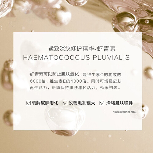 虾青素精华可以延缓皮肤衰老,帮助对抗日常氧化作用,令肌肤重现年轻光彩;保护细胞和DNA健康,无惧皮肤初老现象。