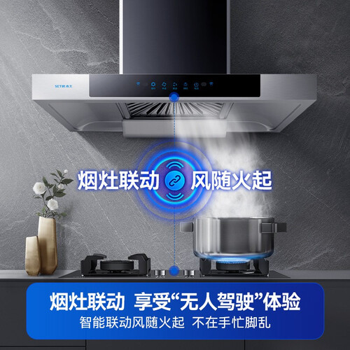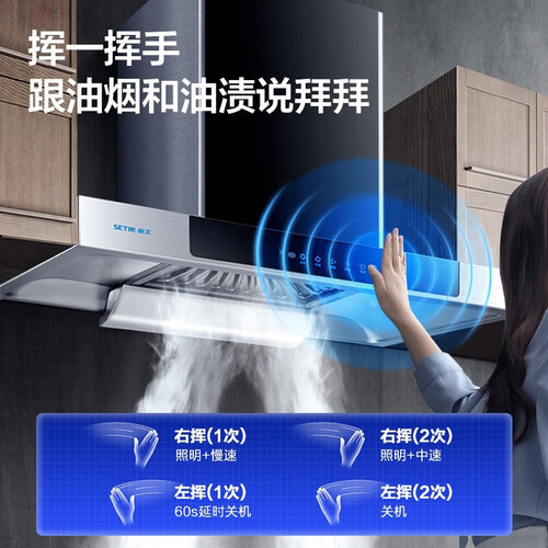 挥一挥手就能轻松操作,油污不会沾染上烟机,洁净更安心。搭配上24m³爆炒大吸力,日常爆炒也能轻松应对。