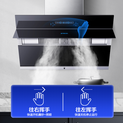 宽屏挡烟板设计,油烟不乱跑,规规矩矩直线吸走,全程体感隔空操作,不用担心污渍粘在面板上。