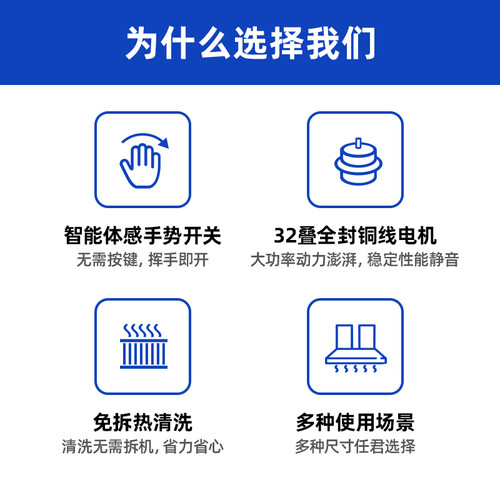 大风量的吸力,足以解决厨房重油烟的环境问题,避免因排烟不畅而发生倒灌。智能挥手的操控设计,摆脱了双手的束缚。