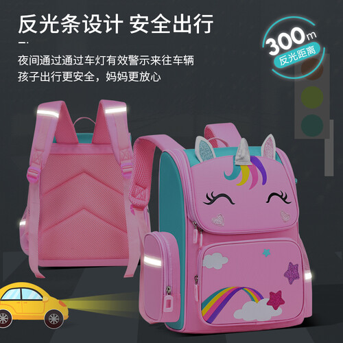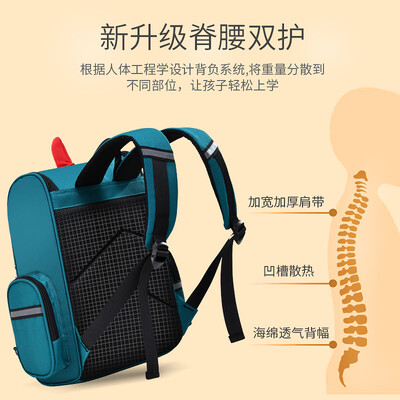 包身采用轻盈的尼龙面料,还设有安全警示反光条,保障孩子在夜间行走安全,多处加固延长了书包的使用寿命。