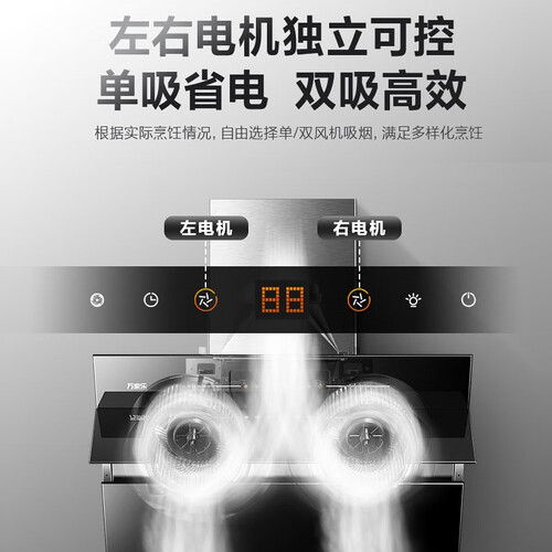 采用双电机运行,动力更强劲,轻松做到瞬吸爆炒油烟。电机下置设计,更靠近烟源,能更快吸取油烟。