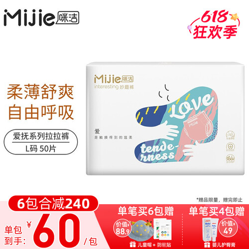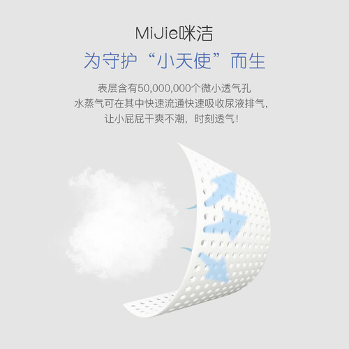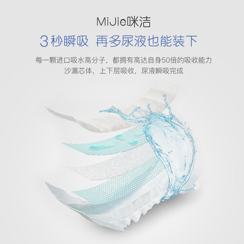 咪洁拉拉裤中的每一颗进口吸水高分子,都拥有高达自身50倍的吸收能力,沙漏型芯体,上下层吸收,瞬吸尿液,再多也不漏。