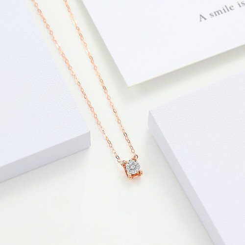 项链采用半圆形镂空构造,托举一颗闪亮的钻石,让钻石光芒更加耀眼迷人。选用18K金材质打造,质感光滑,佩戴十分舒适。