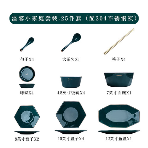一眼就会让人爱上的孔雀绿餐具,以手工描金点缀,视觉上凸显出欧式极简风格。光滑的釉面质感,触感细腻,盛放饭菜别有特色。