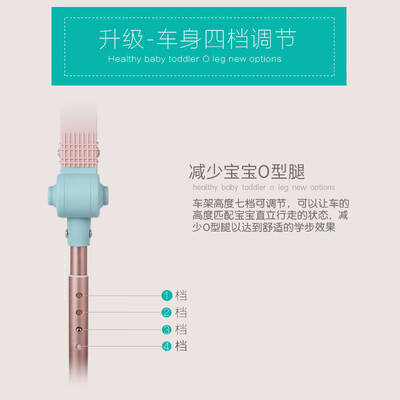 车身四挡调节模式,可根据宝宝身形调节适合的高度,学步更舒适。