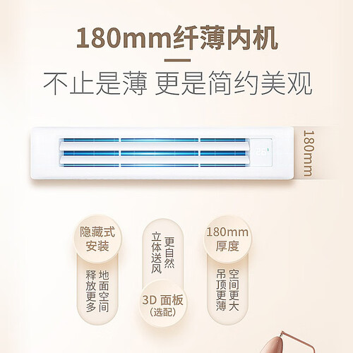 内机采用全钣金材质制作的壳体,外观精美,质地结实耐用,长时间使用不变形。360°环绕送风,家里每个角落都能感受到舒适。