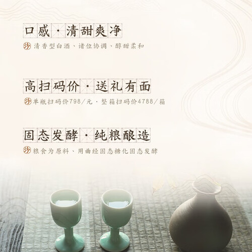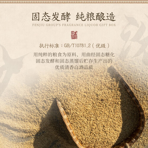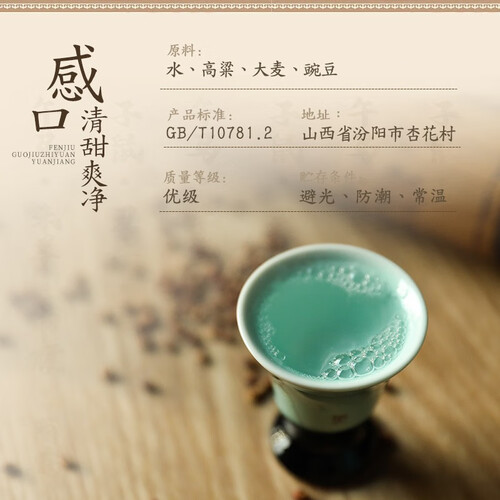 精选高粱、小麦、豌豆为原料,搭配清澈无污染的优质水源,恪守清香工艺悉心酿造而成。