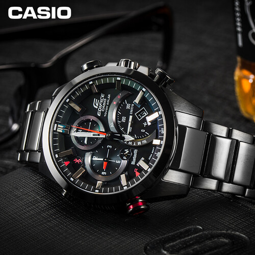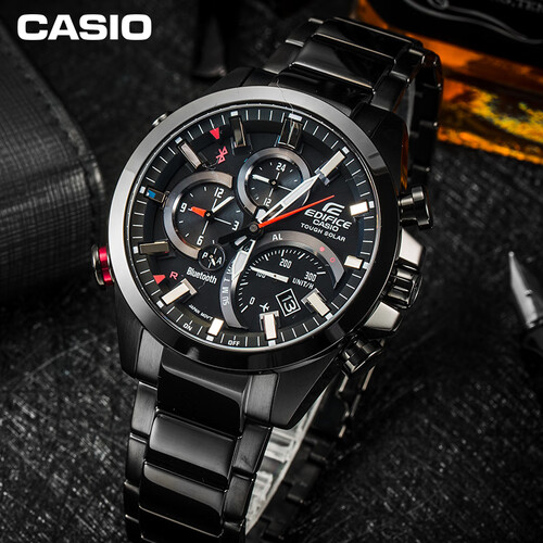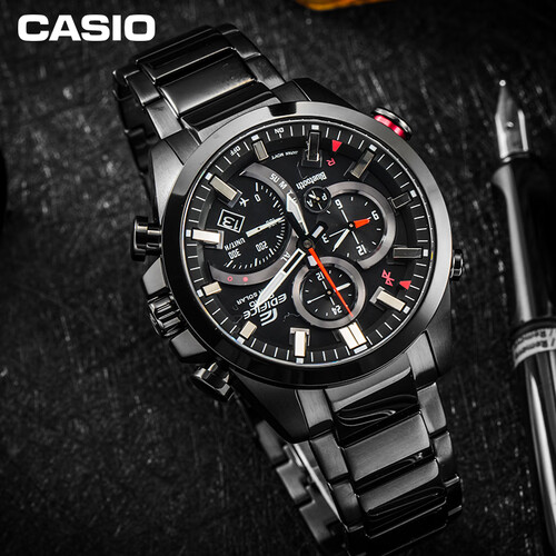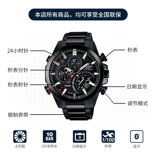 整体为低调沉稳的全黑配色,看上去非常大气。表盘内部采用红、银色点缀,增添表盘亮点。人造蓝宝石玻璃镜面,提升耐磨防刮性能。