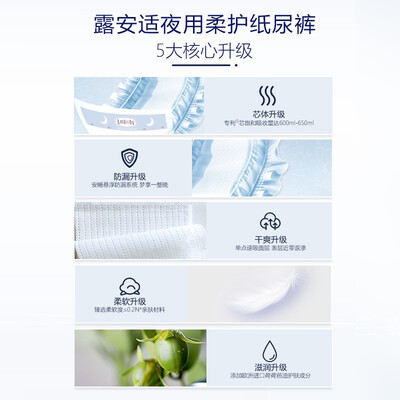 露安适新生婴儿尿不湿采用加宽腰围和双层隔边的设计以防止后漏和侧漏,同时结合V型裁剪,更加柔软贴合,让宝宝自由翻身不怕漏。