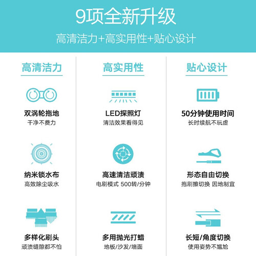 搭载LED探照灯,可以清晰的观察到清洁效果,避免遗漏。50分钟长续航,满足长时间的使用需求,无惧大户型。