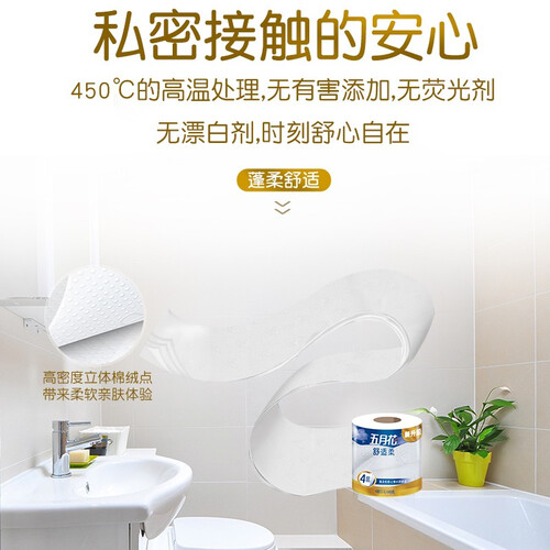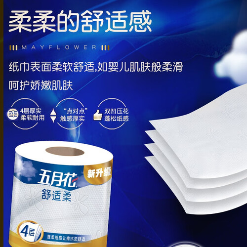 四层加厚经过压花处理,触感如棉花般蓬松,畅享亲肤的用纸生活。精致的压扁处理,纸张紧密贴合,防止分层松散。