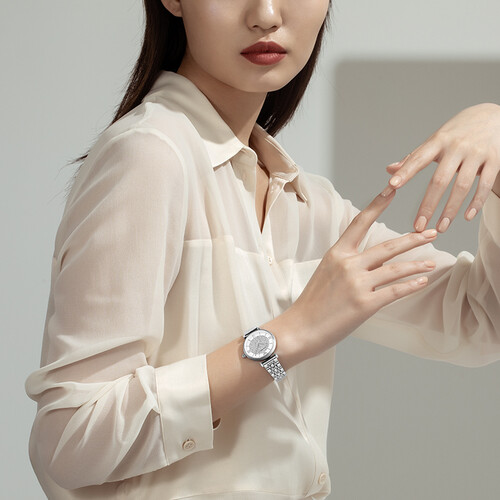 精选优质石英机芯,经久耐用之余走时准确少调时。密镶颗颗锆石的白底圆盘构造,精致显腔调,轻松装扮便可hold住多种场合。