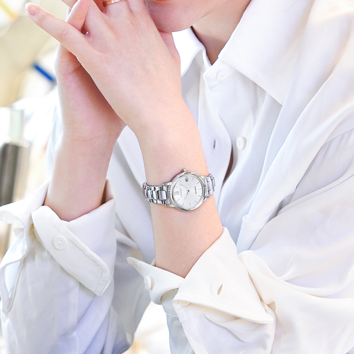 优雅于型,精致于芯,简约的银色表盘搭配极简刻度,优雅柔和,采用管动能机芯,有光就能为手表提供能量,使用非常便利。