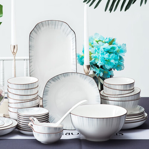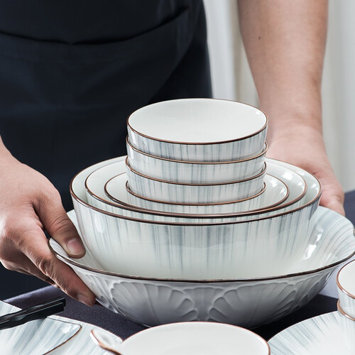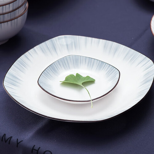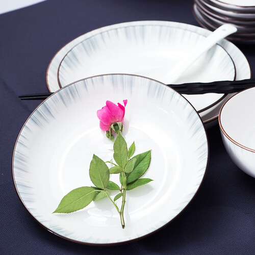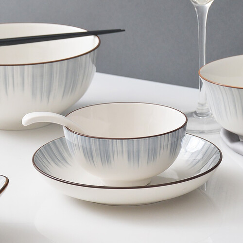 采用釉中彩技术,经过两次高温烧制,让餐具久用不变色。手工描边技术,结合喷绘线条,彰显简约大气感。