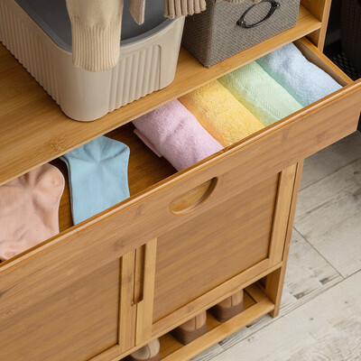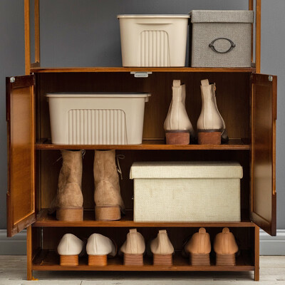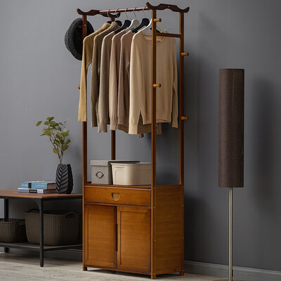 这款衣帽架选用了多层设计,增加了收纳空间。下半部分采用了带抽屉和拉门设计,可以有效防尘。