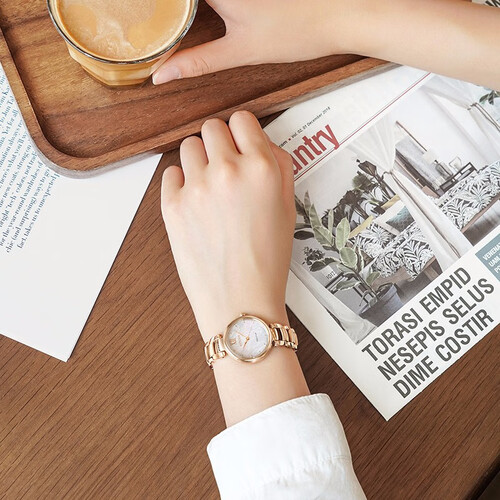 贝母表盘设计,焕发着自然的渐变光晕,为腕部增添一抹清新浪漫光彩。不锈钢材质表带,打磨得光滑细腻,触感温润又舒适。