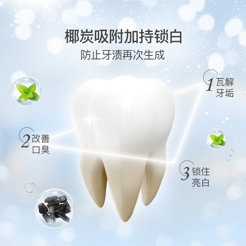 添加研磨微粒和天然椰炭,温和清除顽固烟渍、咖啡渍,可减少细菌生成,吸附口源性口臭,让你整天清新。