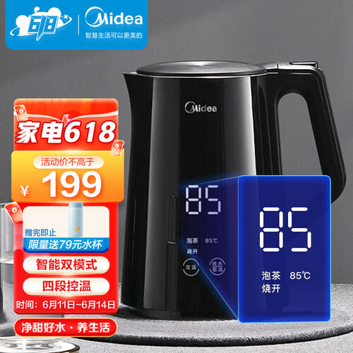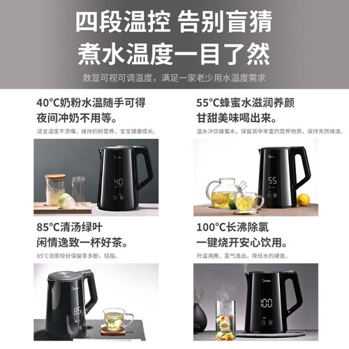 这是一款会显示温度的电热水壶,方便我们饮用,不怕烫嘴,含有四段控温,定制温度,可以长沸腾除氯,饮用更安心。