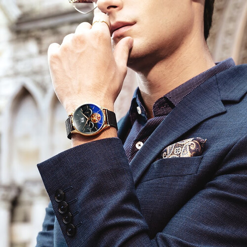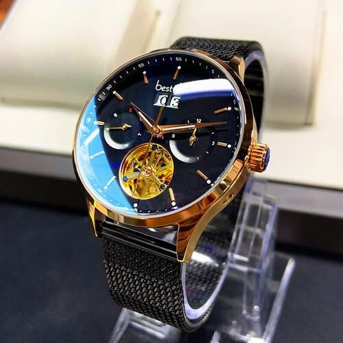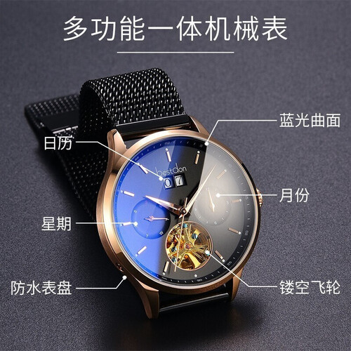 表盘蓝光曲面增强立体和圆润感,不呆板更显青春活力,金色镂空飞轮搭配多字面,多功能更实用,原装机械机芯,性能更稳定。
