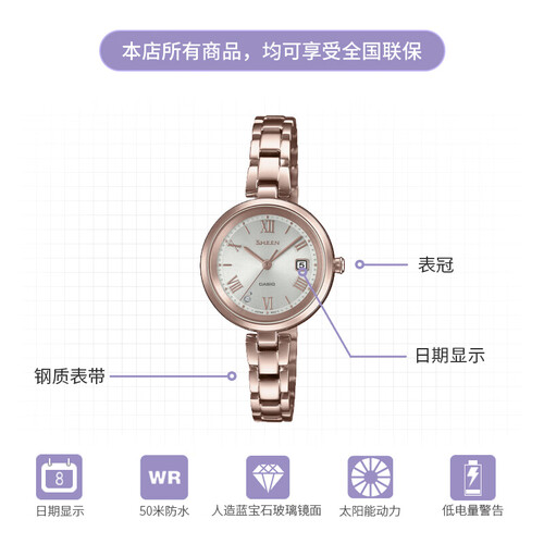 拥有太阳能动力机芯,可以自主完成充电,随时随地充电。矿物质玻璃表镜,拥有高硬度和抗磨性,让手表时刻如新。