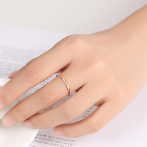 采用时尚的玫瑰金材质打造,加以钻沙的效果设计,整体造型闪耀又很有质感。简约的戒身设计,非常地好搭配。