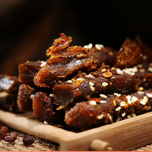 优选牛后腿肉加工而成,肉质紧实有嚼劲,并且易嚼烂。以优质香辛料腌制约4小时,让香辣滋味均匀渗入牛肉纤维。