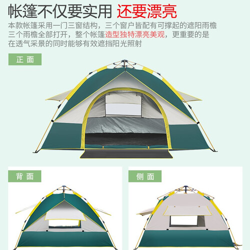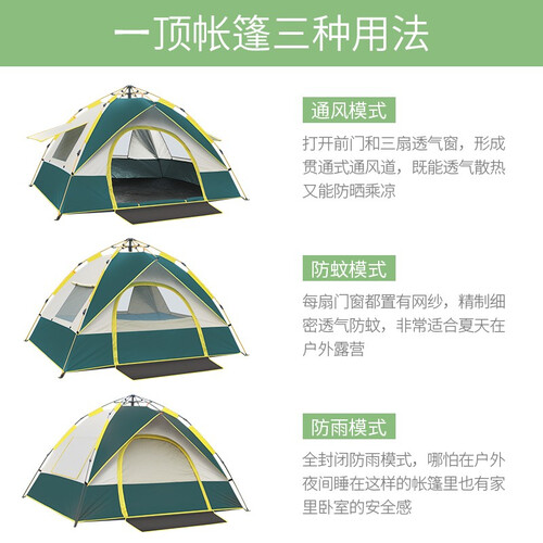 可通风、可防蚊、可防雨三种模式,一顶三用,外出使用更轻松。加大空间设计,容量更大,满足3-5个人员使用。