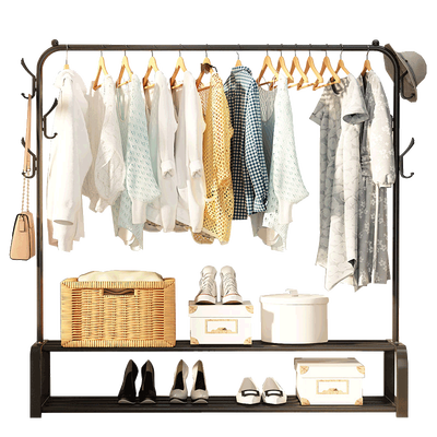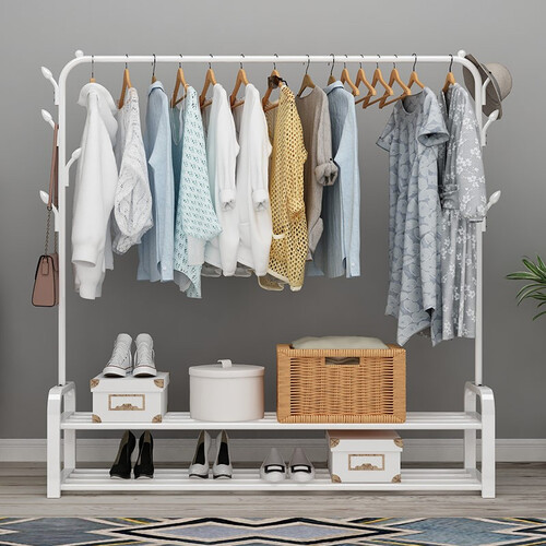 外形简易的衣帽架,只占据狭小空间,衣服排列更加直观。多种功能合为一体,设有置物架,收纳晒衣服两用换鞋更轻松。
