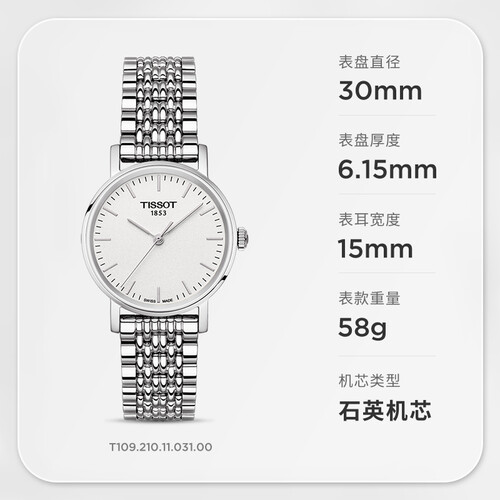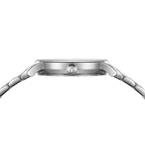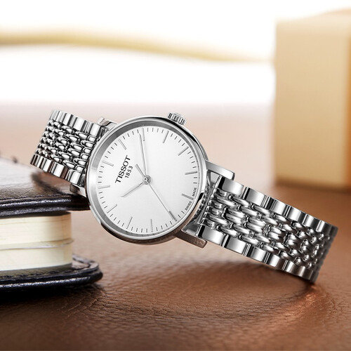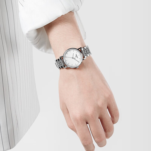 天梭的这款手表,采用打磨细腻的不锈钢底盖,有效保护机芯,牢固耐用,流线型不锈钢表链,贴合手腕,佩戴舒适。