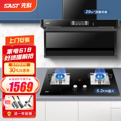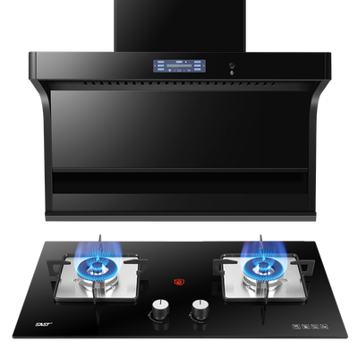 采用顶吸和侧吸二合一的设计,保持强大的吸力,带有更多的油烟。燃气灶带有方形的聚能环,减少热量的流失,更好受热。