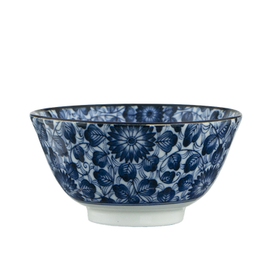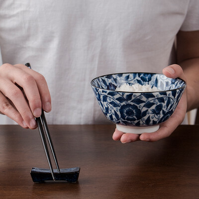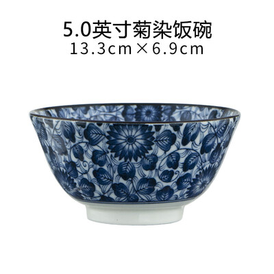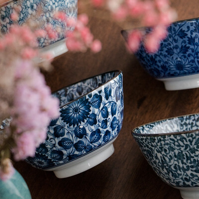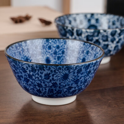 日式风格陶瓷碗,以蓝色为基调,清新雅致,别具特色。通过釉下彩工艺加工,色牢度高,久用不易褪色。
