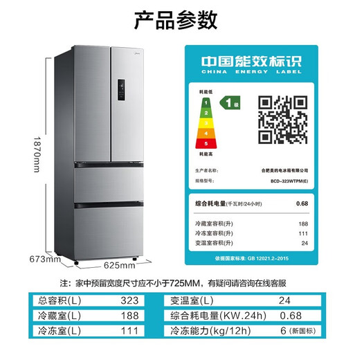 美的一级能效风冷冰箱