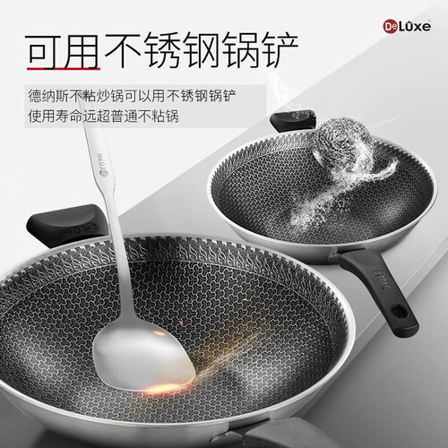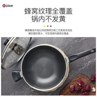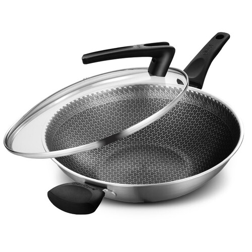 微蜂全面屏炒锅,蜂窝纹点状结构,密度更大,杜绝粘贴,食品级原料制造,安全省心,均匀受热锅底,不发黑,不变形。