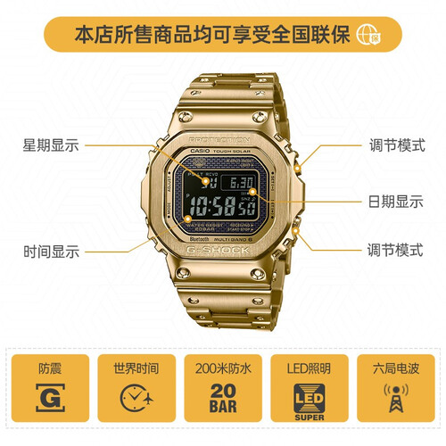 亮丽的金色全金属外观给人坚韧强悍的感觉,佩戴在手上更显硬朗利落,内部搭载电波太阳能模块,可实现光能转换电能,续航持久。