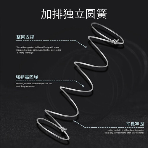 精选高级透气针织面料,触感柔软又细腻,吸湿透气,散热干爽。内置整网精钢弹簧,回弹性好,均衡受力使全身放松,舒缓整天疲劳。